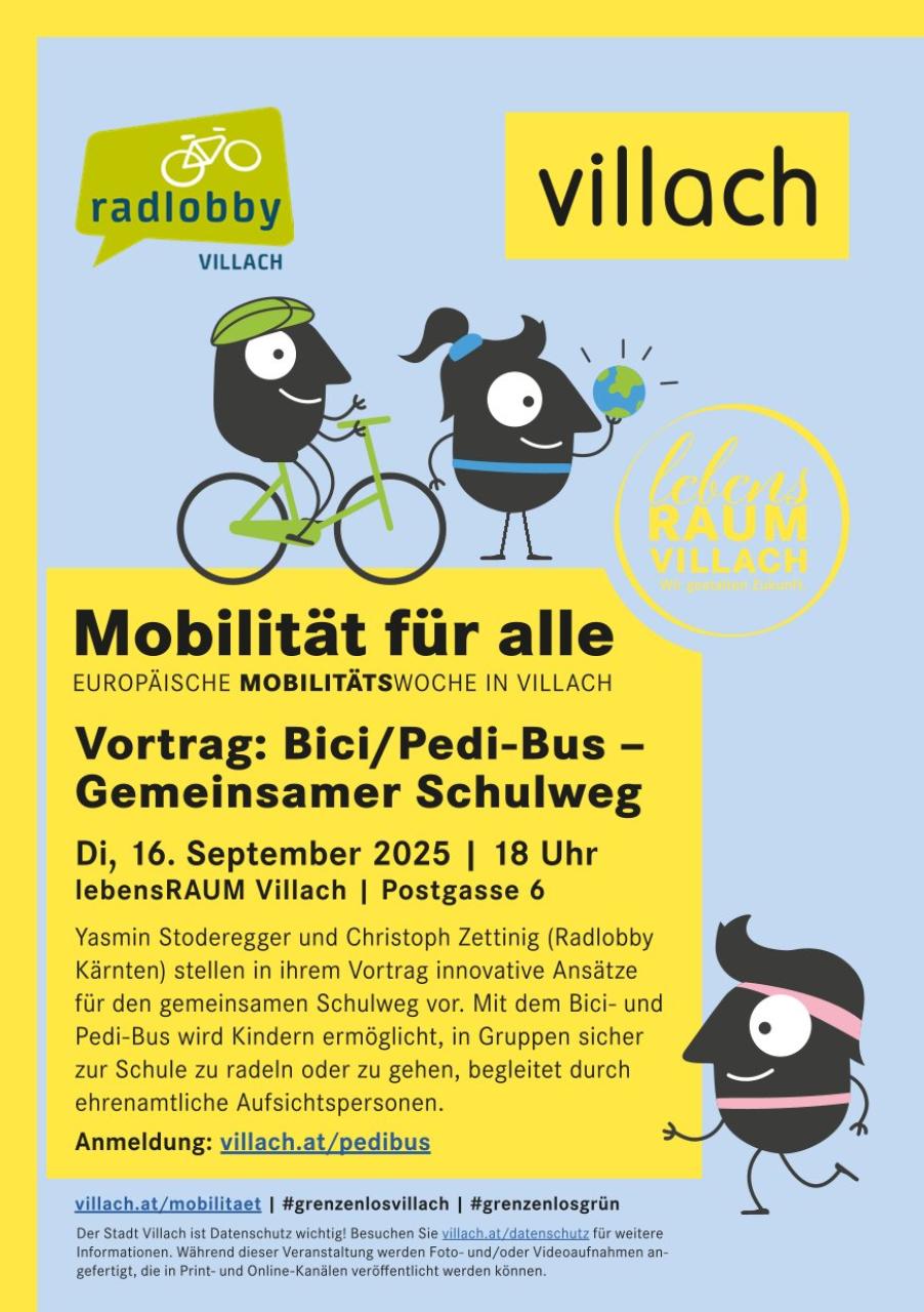 Yasmin Stoderegger und Christoph Zettinig (Radlobby Kärnten) stellen in ihrem Vortrag innovative Ansätze für den gemeinsamen Schulweg vor. Mit dem Bici- und Pedi-Bus wird Kindern ermöglicht, in Gruppen sicher zur Schule zu radeln oder zu gehen, begleitet durch ehrenamtliche Aufsichtspersonen.