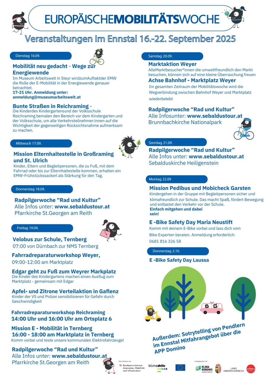 Das Ennstal in der Europäischen Mobilitätswoche“ Von St. Ulrich bis Weyer setzen die Gemeinden im Zeitraum von 16.-23. September Aktionen um, klimafreundliche Mobilität zu unterstützen. Eine Übersicht dazu gibt es im beigelegten Aktionskalender.