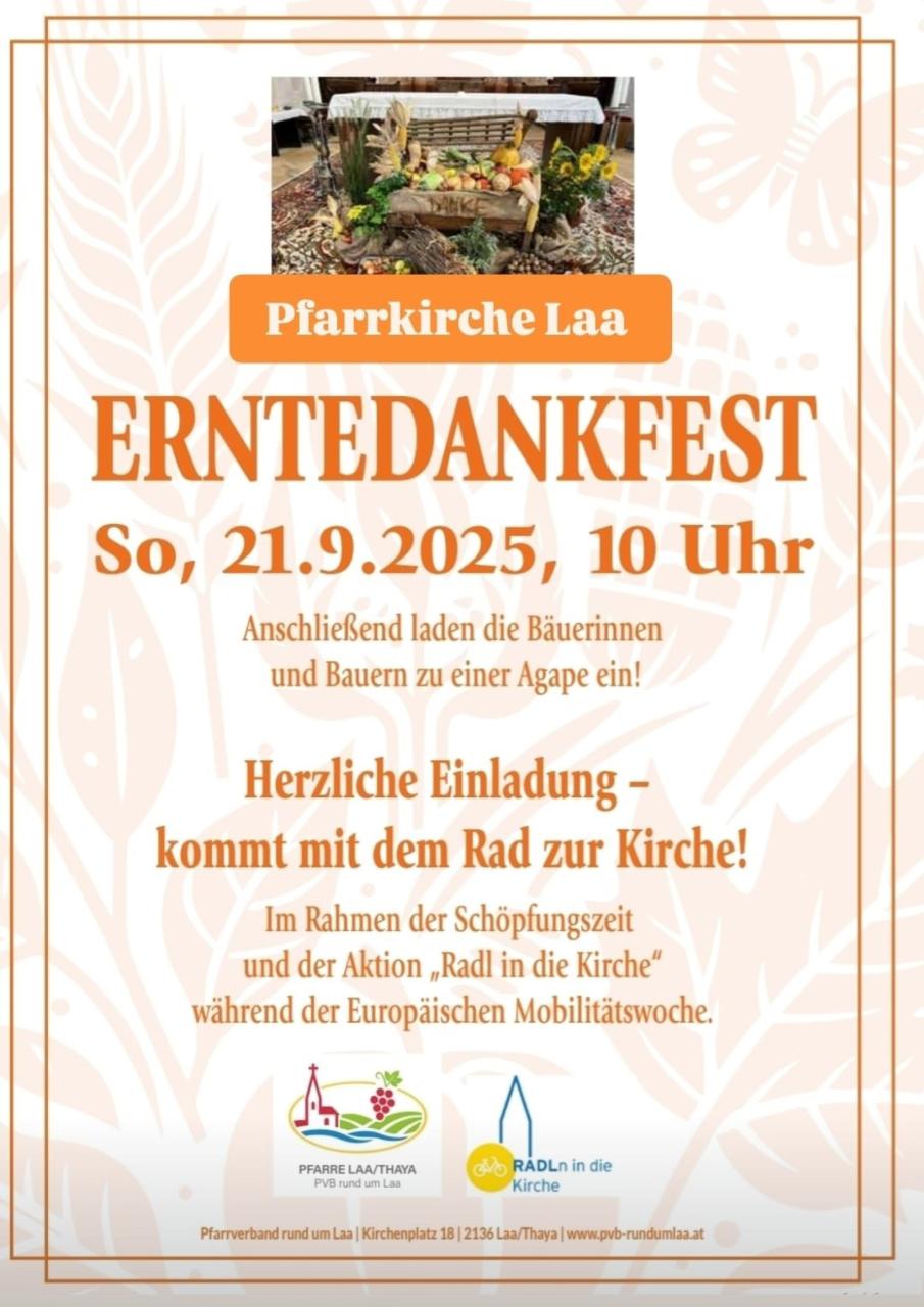Die röm. kath. Pfarrgemeinde Laa an der Thaya lädt am 21.9. zum Erntedankfest mit dem Radl in die Kirche zu kommen.