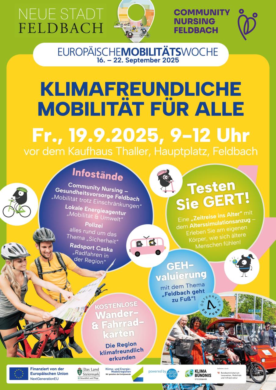 Die Stadtgemeinde Feldbach lädt herzlich zum diesjährigen Mobilitätstag für alle ein – im Rahmen der Europäischen Mobilitätswoche. Unter dem Motto „Klimafreundliche Mobilität für alle“ erwartet Sie ein buntes Programm für Jung und Alt: Informationen, Aktionen, Spiele und die Möglichkeit, selbst aktiv mitzuwirken.