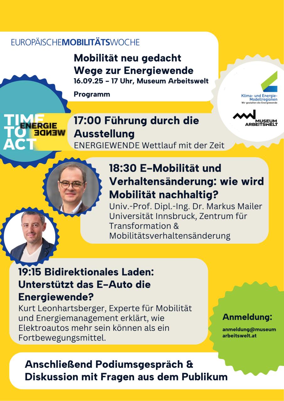 Gemeinsam mit der Klima- und Energiemodellregion Ennstal – Steyrtal lädt das Museum Arbeitswelt im Rahmen der Europäischen Mobilitätswoche dazu ein, über Ideen für die Mobilität der Zukunft zu diskutieren.