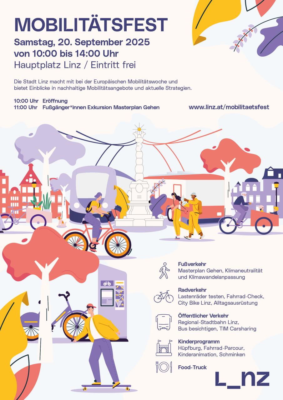 Die Stadt Linz veranstaltet dieses Jahr wieder ein Mobilitätsfest im Zuge der Europäischen Mobilitätswoche am Linzer Hauptplatz. Das frei zugängliche Event findet am Samstag 20. September, von 10 bis 14 Uhr vor dem Alten Rathaus statt.