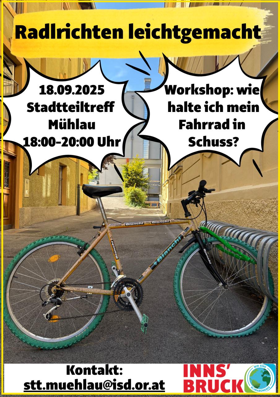 Im Rahmen der europäischen Mobilitätswoche gibt´s beim Stadtteiltreff Mühlau einen Fahrrad-Reparatur-Workshop.