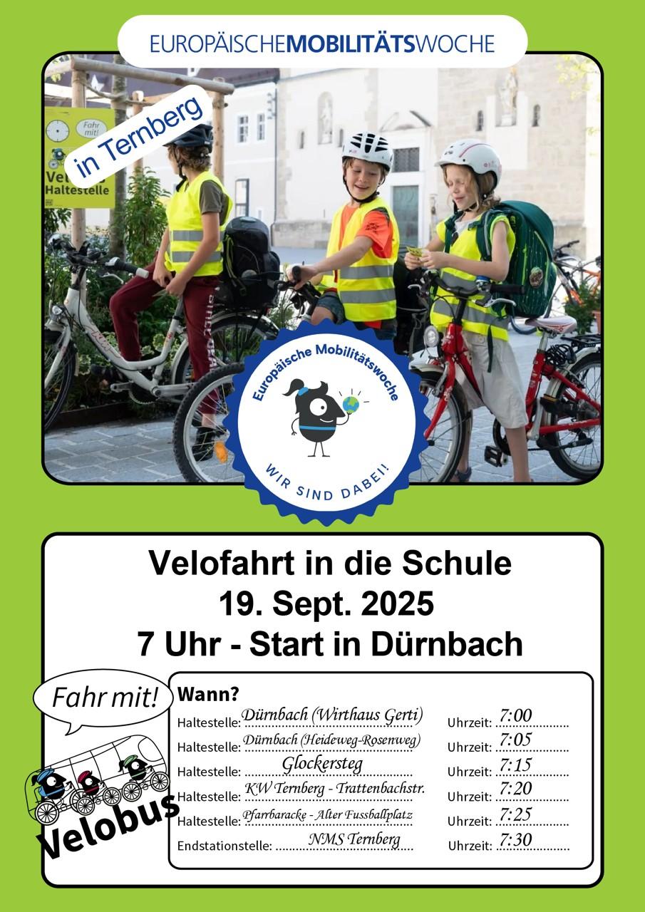 Velofahrt in die Schule NMS Ternberg am 19. September. Start um 7 Uhr in Dürnbach, vier weitere Haltestellen werden anefahren.