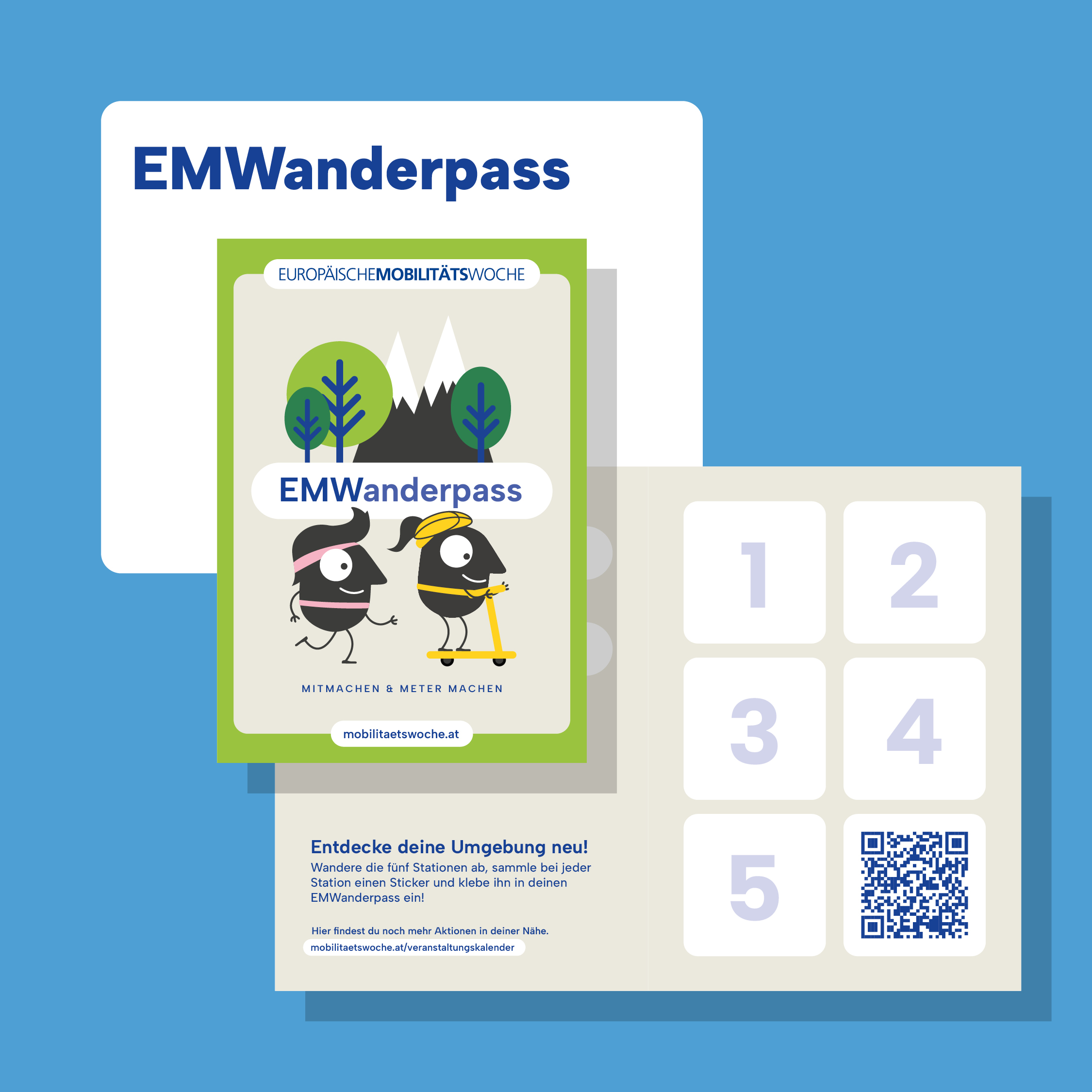 Begleitmaterial zum Aktionsformat „EMWanderweg“. In den Wanderpass müssen die Sticker, die bei den gesetzten Stationen verteilt werden, eingeklebt werden.